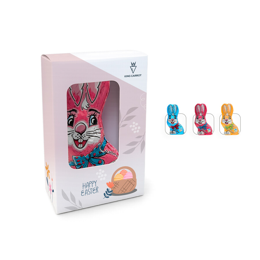 Inhalt: 1 Stück, Füllung: Osterhase Pink 60 g, Geschmack: Milchschokolade, Format: 68 x 96 x 143 mm, Verpackungseinheit: 20 Stück, Haltbarkeit: 6 Monate bei sachgerechter Lagerung, Lieferzeit: ca. 20 Arbeitstage nach Druckfreigabe, Artikelnummer: 01001865_1