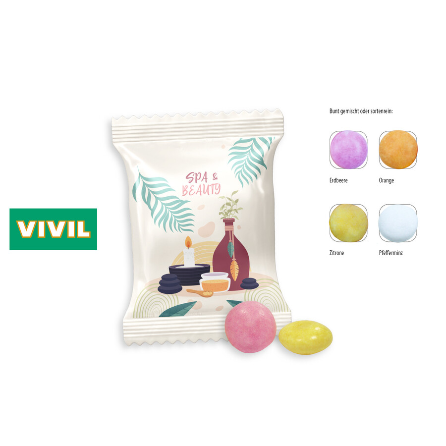 Inhalt: 2 Stück, Füllung: VIVIL Kaudragee bunt gemischt, Geschmack: Erdbeere, Orange, Zitrone, Pfefferminz, Format: 60 x 72 mm, Verpackungseinheit: 500 Stück, Haltbarkeit: 12 Monate bei sachgerechter Lagerung, Lieferzeit: ca. 15 Arbeitstage nach Druckfreigabe, Artikelnummer: 01000060_1